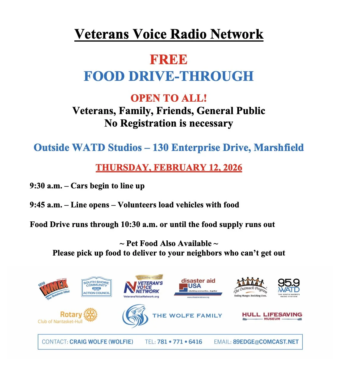 Food Drive-Through. The Veteran’s Voice and WATD/WMEX food drive through is open to all veterans, family and friends, and the public. No registration necessary, no cost! The second Thursday of every month from 9:45 a.m., 130 Enterprise Drive in Marshfield. Drive through and we will load up your vehicle. For more information contact Craig Wolfe at 781-771-6416 or 89edge@comcast.net