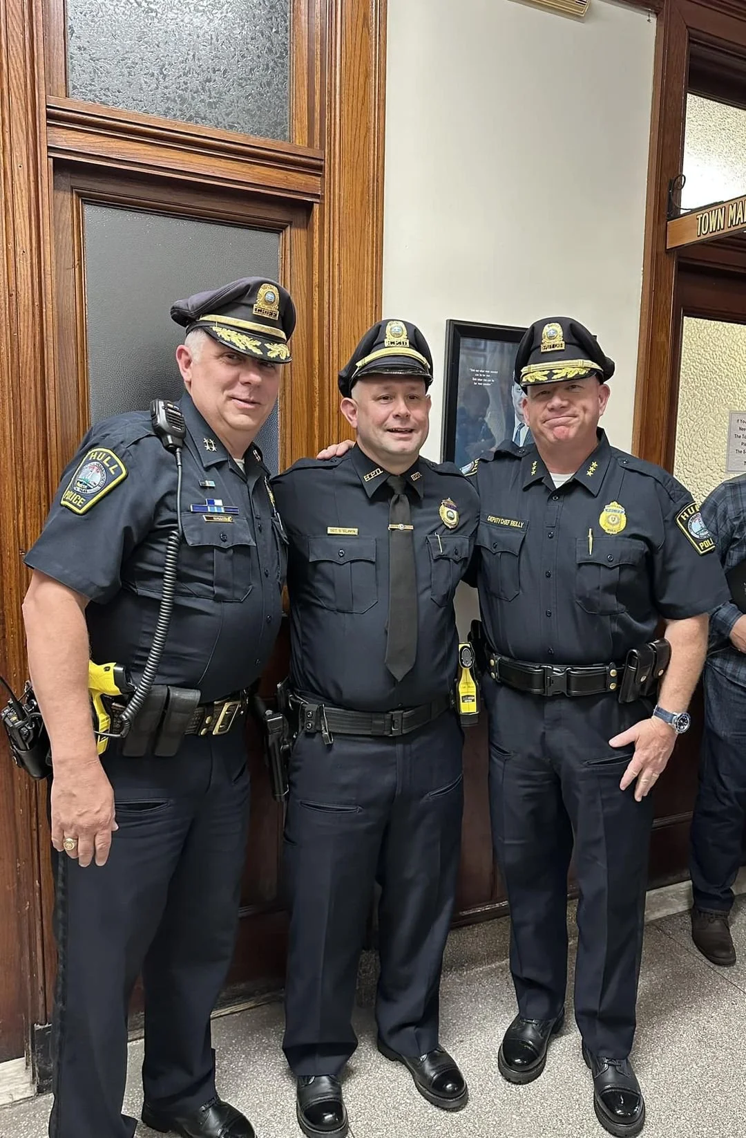 TOP BRASS. Hull Police’s Stephen Glavin, center, was promoted from sergeant to lieutenant on Wednesday. He is flanked by Chief John Dunn, left, and Deputy Chief Neil Reilly. Glavin previously served as a detective and is a crisis negotiator with the MetroLEC regional SWAT team. They are standing in the hall outside the town manager’s office, where Dunn will fill in as the Hull’s acting chief executive following Philip Lemnios’s retirement Thursday. [Courtesy photo]