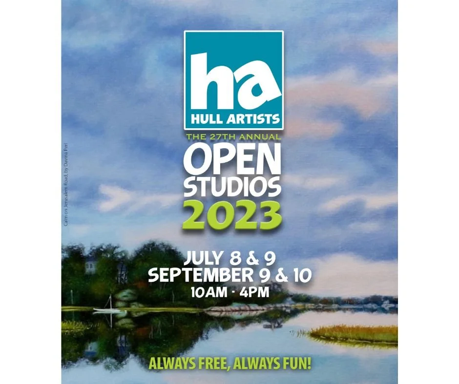 The event takes place on July 8 and 9, from 10 a.m. to 4 p.m., with free admission and parking. A self-guided map guides you to 30 artists at 22 locations throughout Hull and neighboring towns. Featured media include painting (oil, acrylic, watercolor), mixed media, photography, fiber arts, encaustic, jewelry, drawing, collage, and more.