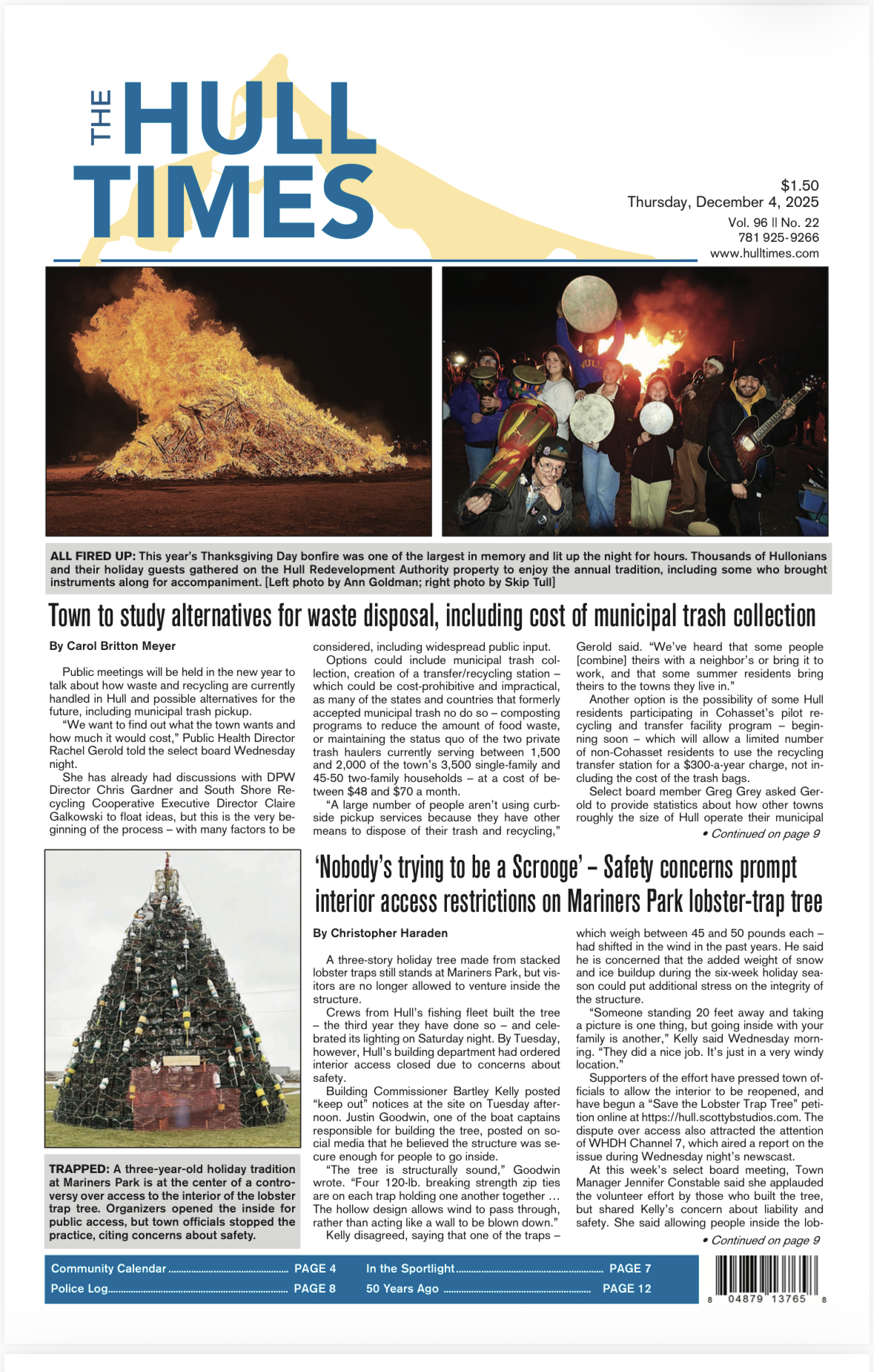 Supporters of the effort have pressed town officials to allow the interior to be reopened, and have begun a “Save the Lobster Trap Tree” petition online at https://hull.scottybstudios.com. The dispute over access also attracted the attention of WHDH Channel 7, which aired a report on the issue during Wednesday night’s newscast.