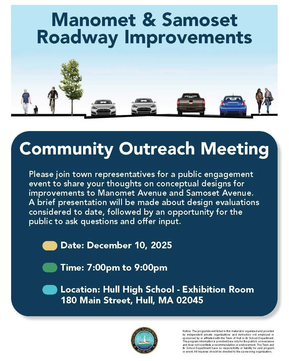 /The public is invited to share thoughts on conceptual designs for improvements to Manomet Avenue and Samoset Avenue. A brief presentation will be made about design evaluations considered to date, followed by an opportunity for the public to ask questions and offer input.