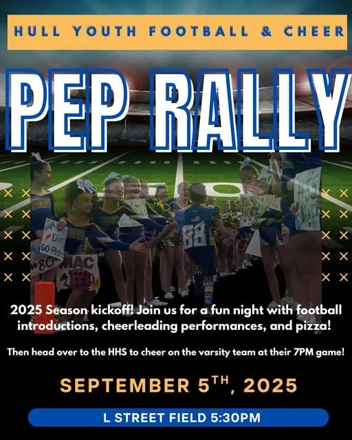 • Hull Youth Football and Cheer will kick of its season with a pep rally on Friday, September 5 at L Street at 5:30 p.m. A fun night is planned with football introductions, cheerleading performances, and pizza. At 7 p.m., everyone is planning to head to Hull High to cheer on the varsity team in its game against Wareham.