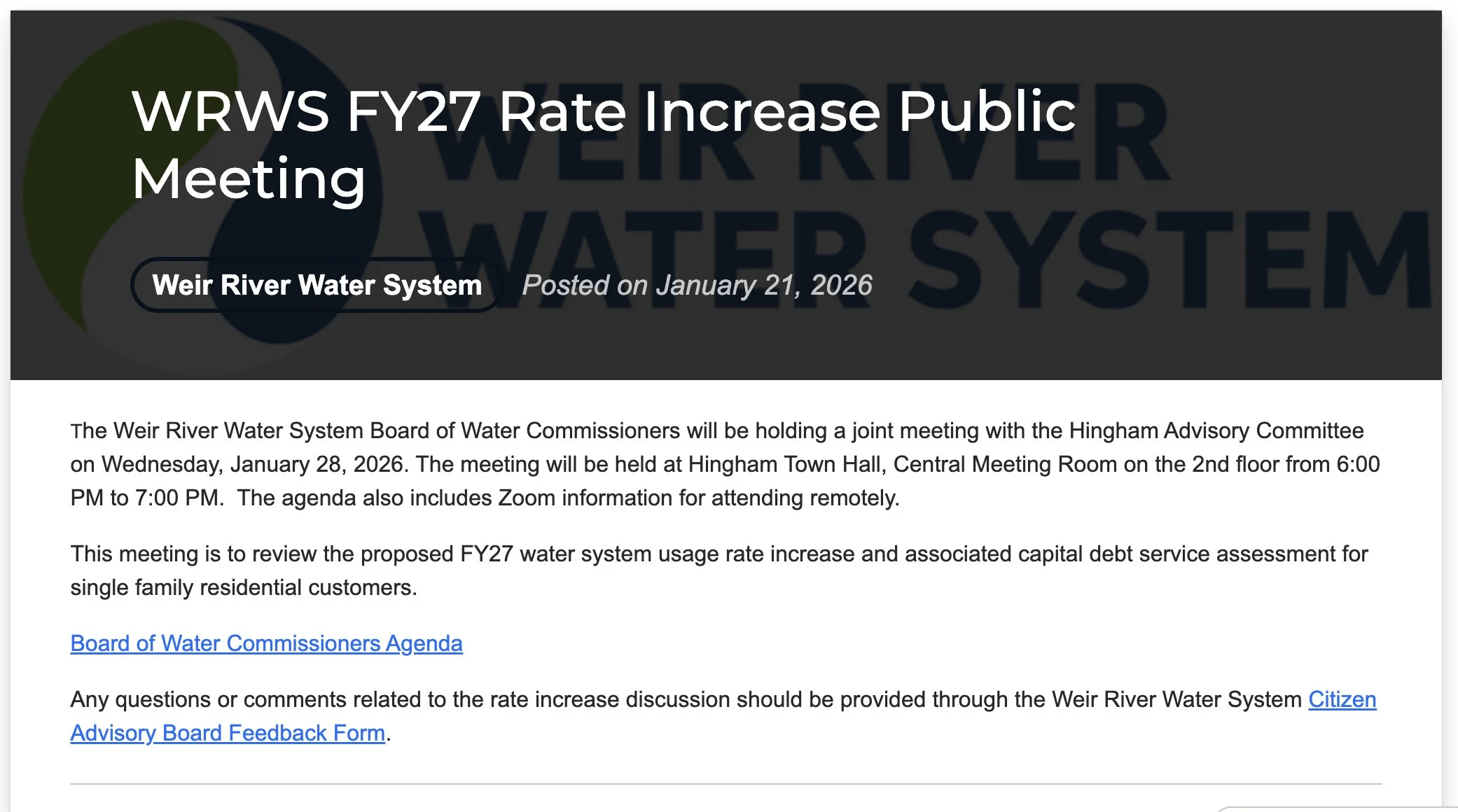 /The Weir River Water System Board of Water Commissioners will hold a joint meeting with the Hingham Advisory Committee on Wednesday, January 28, at Hingham Town Hall, Central Meeting Room (second floor), from 6 to 7 p.m.