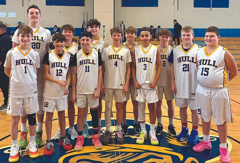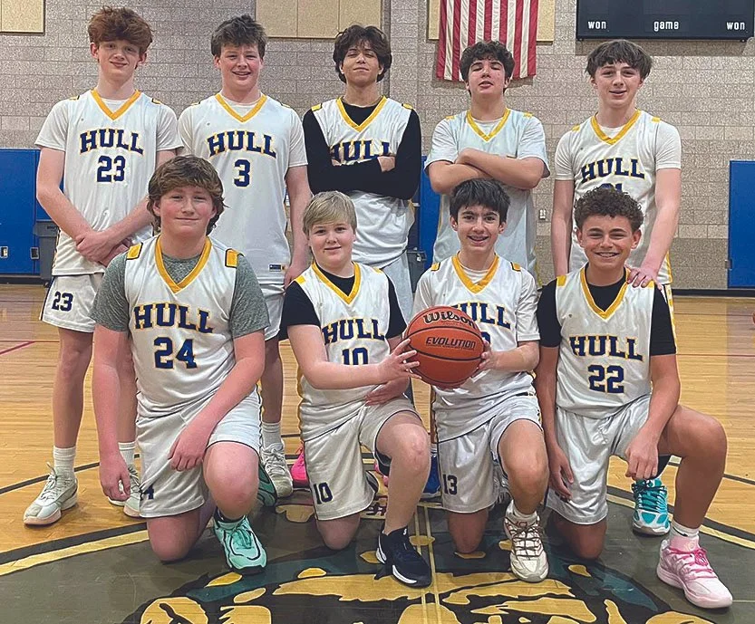 BIG WIN for the Eighth-Grade Boys basketball team last weekend, coming out on top over Hanover, 40-36. On Saturday, March 21 at 12 p.m. Duxbury will come to the gym at Hull High to face the home team in the semi-final round. [Courtesy photo]