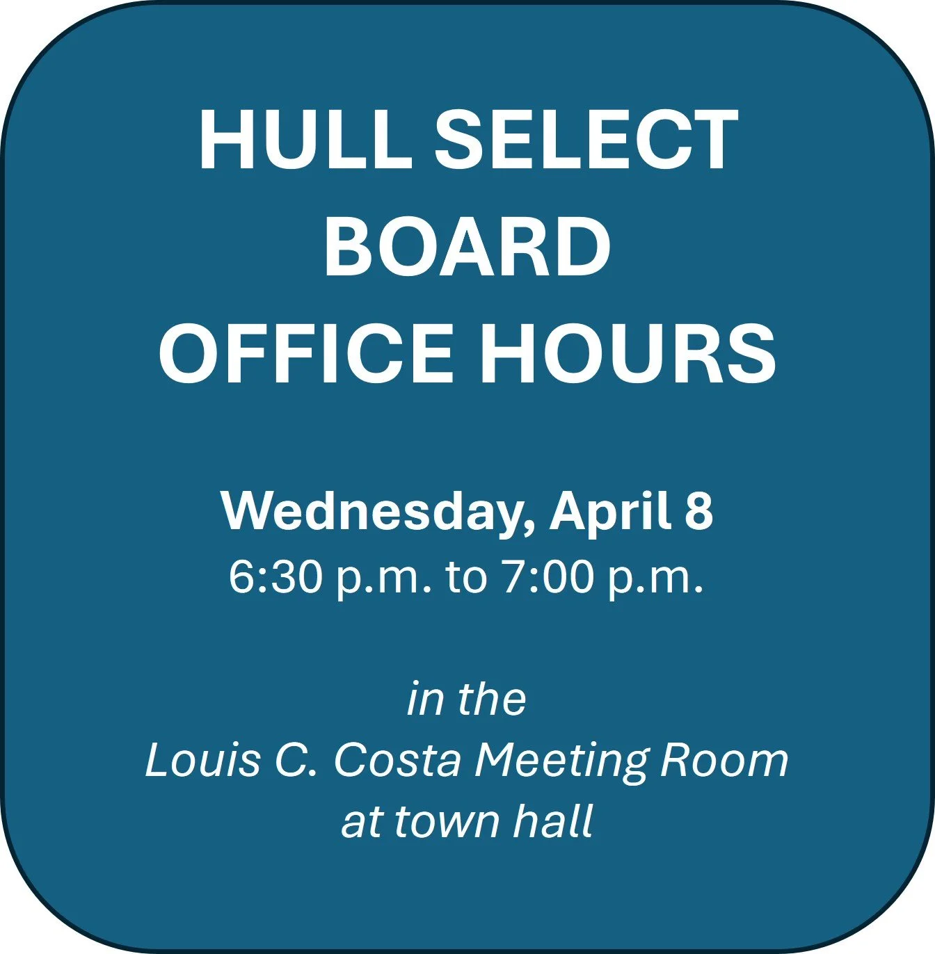 • The select board will begin offering its new once-a-month office hours prior to the beginning of the April 8 meeting, from 6:30 p.m. to 7 p.m. Grey and board member Jerry Taverna will be present to talk with citizens who would like to ask questions, provide input on a particular subject, or share their thoughts. The board will decide whether to put any of the subjects that are talked about during the office hours – which will not be taped by Hull Community TV as are the regular meetings – on an upcoming agenda or address them in another way.