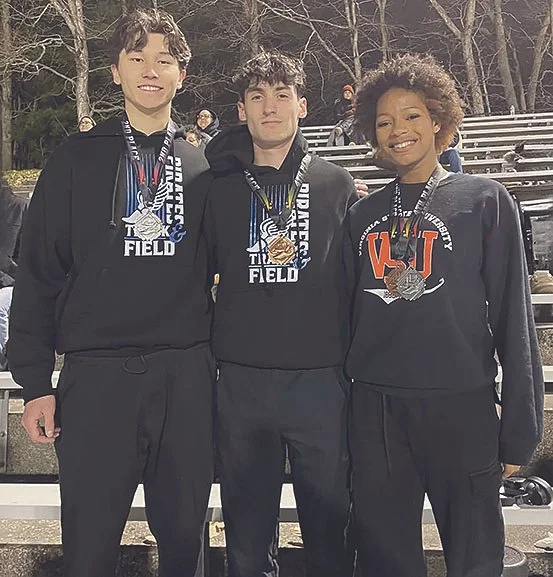 /TRACKING VICTORY: At the Greater New Bedford Sunset Invitational Meet on April 18, the Hull High track team’s medalists were, from left, Lawrence Bodley, Christopher Resnick, and Bree Simpson-Sliney. [Photo courtesy of Brian Lanner]