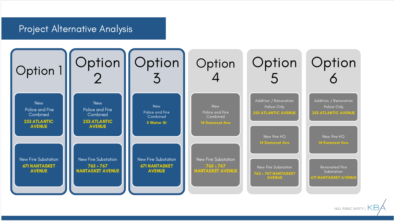 Option one calls for a new combined police and fire station at 253 Atlantic Ave., where town hall is located but will become vacant when offices move to the Memorial School, with a new fire substation at 671 Nantasket Ave. where the Central Fire Station is currently situated; the second for a new combined facility at 253 Nantasket Ave. and a new fire substation at 767 Nantasket Ave. (the corner of N Street and Nantasket Avenue, the site purchased by the town as a potential location for a new library); and a new combined facility at in the center section of the HRA property (listed as 5 Water Street in the report) and a new fire substation at 671 Nantasket Ave. Most of the property is in the flood plain.